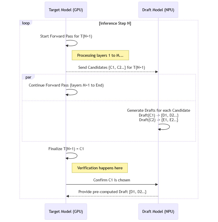 草稿模型并行化:在多 NPU 环境下,草稿模型则采用一种专门设计的 SPD(Speculative Parallel Decoding)架构。这种架构减少了 NPU 核心之间的同步需求,允许它们更独立地进行分支预测,进一步提升了草稿生成的效率。