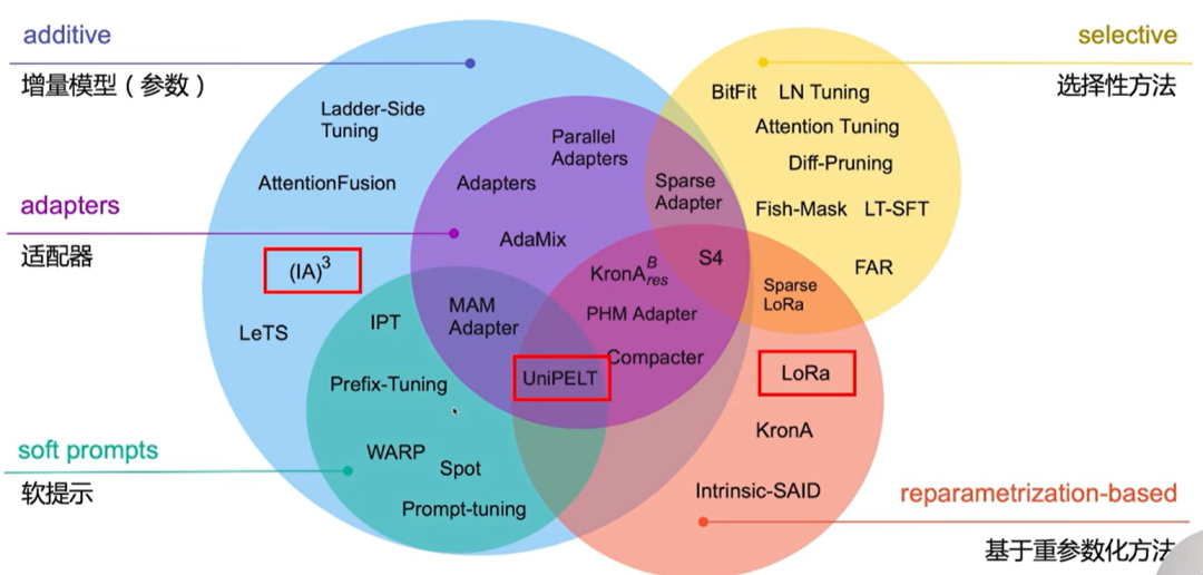- Reparametrization-based(改):不直接改原参数,用一种更高效的方式(如低秩分解)来表示对参数的改动,最终这个改动还能合并回去。