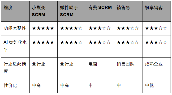 从测评结果可以看出,小裂变SCRM在功能完整性和AI智能化水平方面表现突出,适用于全行业;微伴助手SCRM在行业适配精度也有不错的表现;有赞SCRM专注于电商行业;销售易和纷享销客则在特定领域具有优势。企业可根据自身需求,选择最适合的SCRM工具。