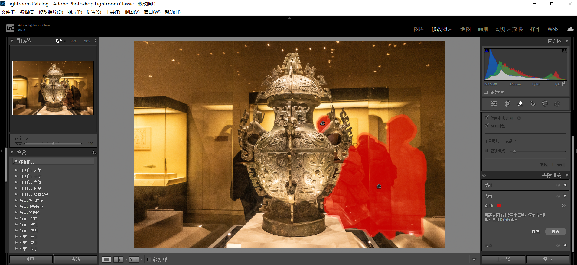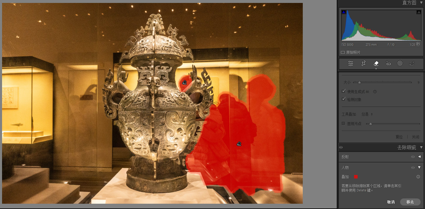- 操作方式: 在AI面板中找到类似“画笔”、“添加选区”或“涂抹”的工具。选择它,然后像使用画笔一样,在照片中未被AI识别出的人物区域进行仔细涂抹覆盖。涂抹时尽量精确,覆盖住目标人物的所有部分(如下图自行涂抹画面所示)。软件会实时将你的涂抹区域添加到待移除的对象列表中。