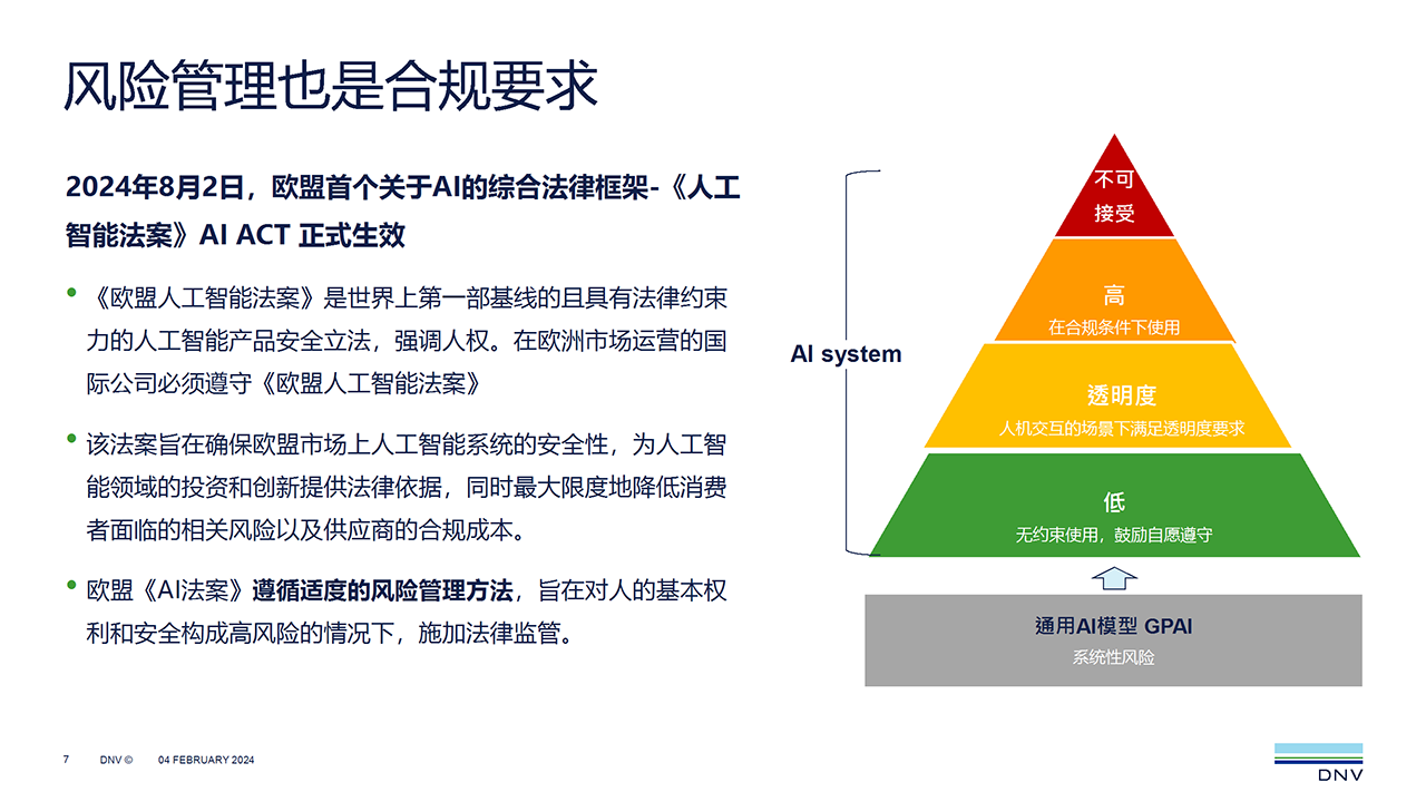 法律合规是AI治理的强制性要求。欧盟《人工智能法案》(AI Act)是世界上第一部基线且具有法律约束力的人工智能产品安全立法,已于2024年8月2日正式生效 。