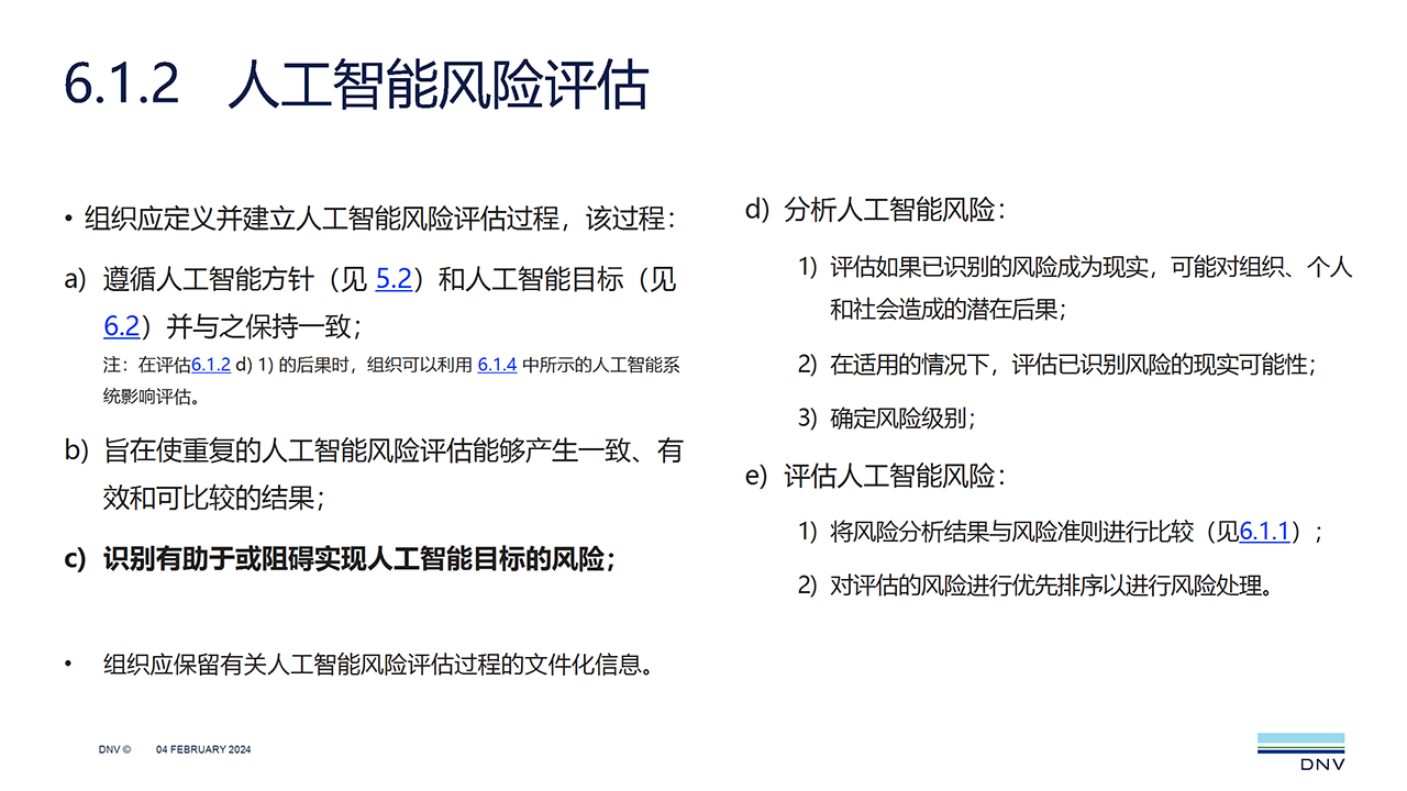 风险管理是AIMS的核心。组织需要建立**人工智能风险评估(AI Risk Assessment)和人工智能系统影响评估(AIIA)**过程 。