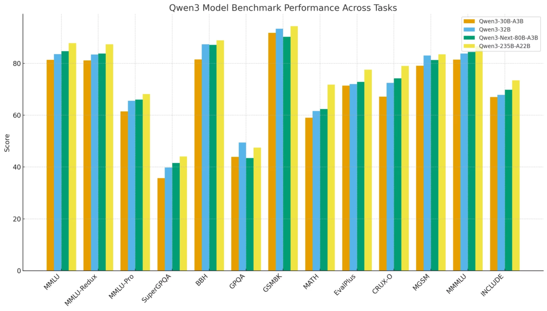 - 在 MMLU、BBH 等综合推理测试中,表现接近密集模型 Qwen3-235B;