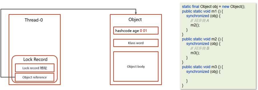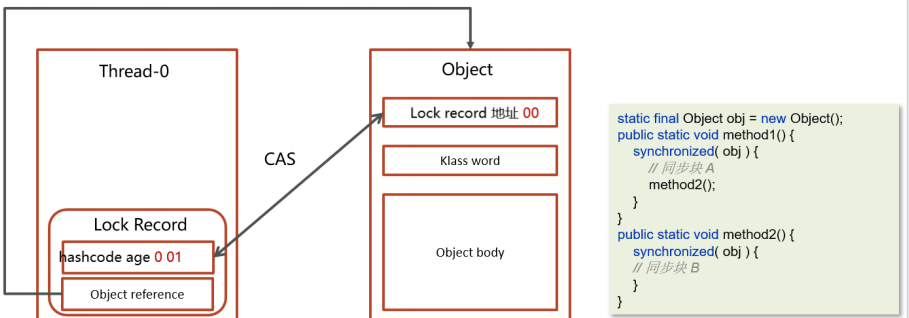 1.在线程栈中创建一个Lock Record,将其obj字段指向锁对象。