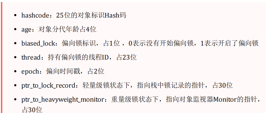 - Mark Word:存储对象自身的运行时数据,如哈希码、GC 分代年龄、锁状态标志、线程持有的锁、偏向线程 ID 等。它是实现锁的“主战场”。