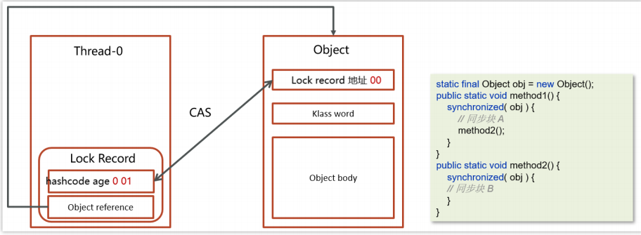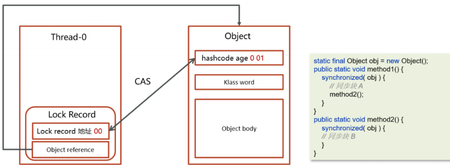 2.通过CAS指令将Lock Record的地址存储在对象头的mark word中(数据进行交换),如果对象处于无锁状态代表该线程获得了轻量级锁。