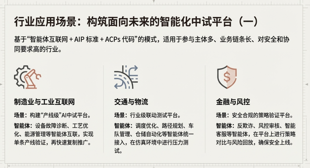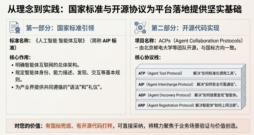 这些行业有一个共同特点:参与主体多、业务链条长、对安全和协同要求高。正因为如此,越适合用“智能体互联网 + AIP 国标 + ACPs 开源协议”来搭建自己的行业中试平台——底座统一、接口开放、生态可扩展。