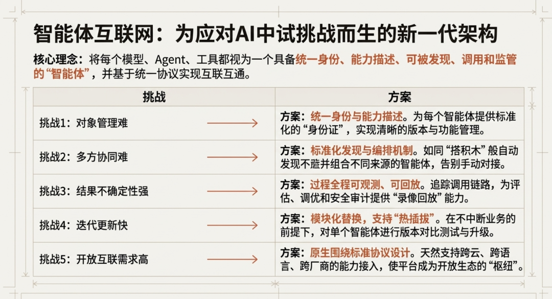 在这张网里,每一个模型、Agent、工具,都变成一个有身份证、有能力说明、能被发现、能被调用、能被监管的“智能体”,大家都按统一的协议来互联互通。