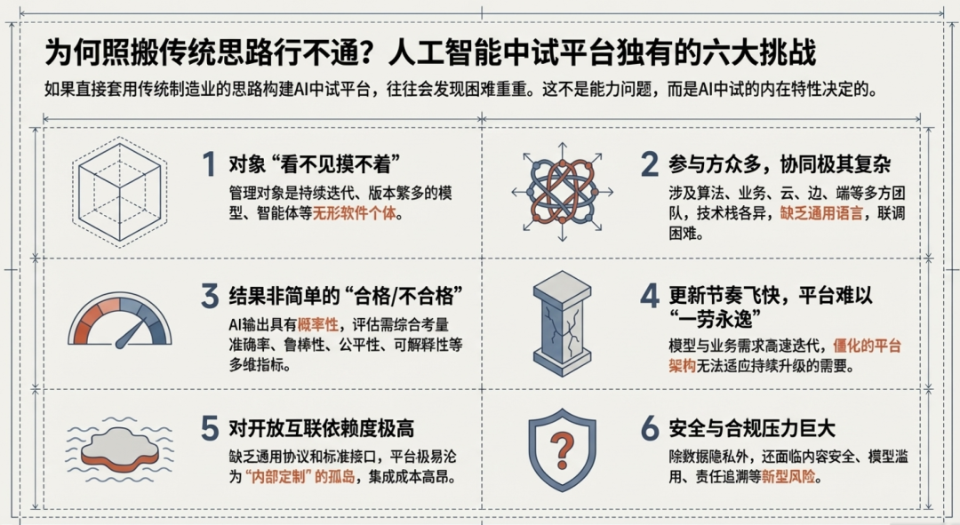 传统中试很多指标是硬的:合不合格、一不一致。AI系统的输出是概率性的,要考虑准确率、鲁棒性、公平性、可解释性,还有用户体验。你很难用一两条指标,就给出“能不能上线”的结论。