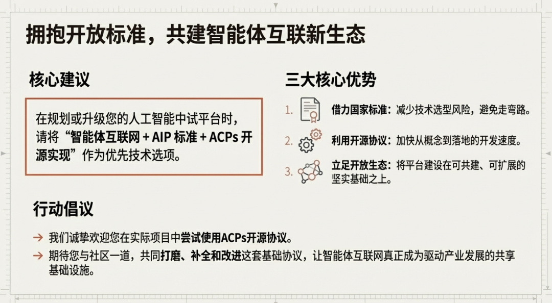 如果你正在考虑建设或升级人工智能中试平台,不妨把“智能体互联网 + AIP 标准 + ACPs 开源实现”视作优先选项: