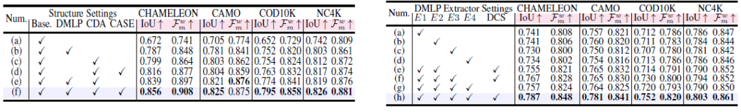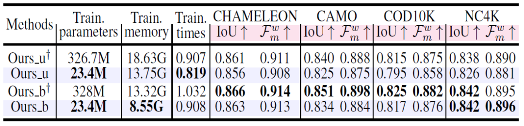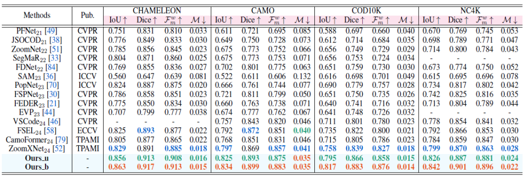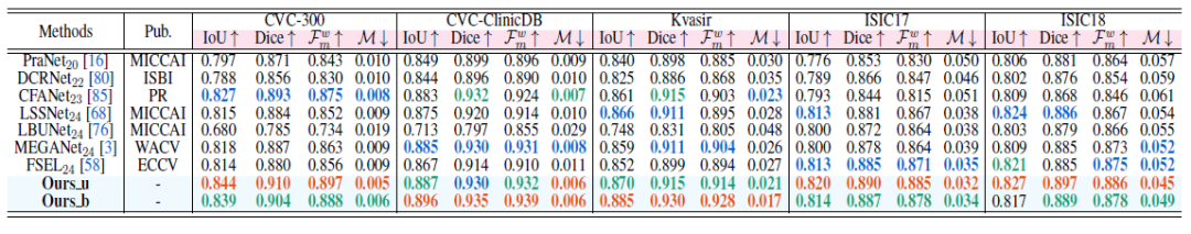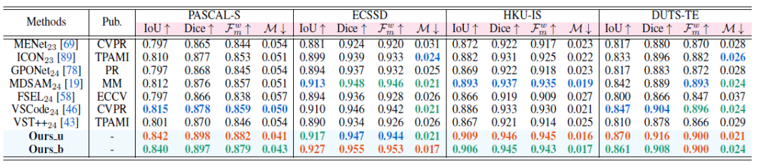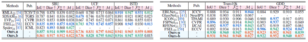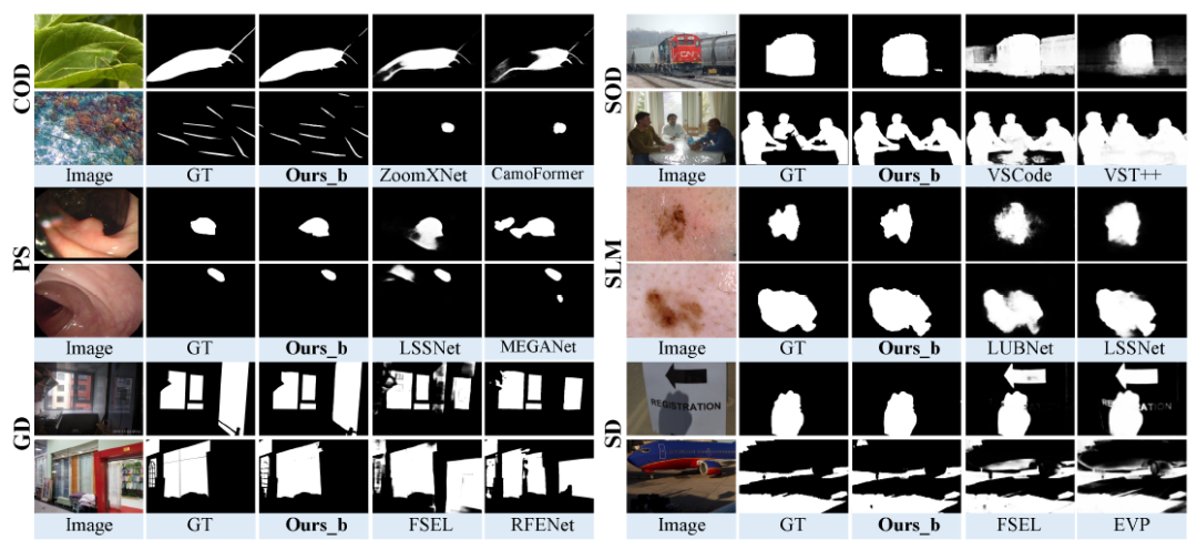 - 在6个二进制目标分割任务进行了性能对比,包括伪装目标检测(COD)、显著目标检测(SOD)、息肉分割(PS)、皮肤病变分割(SLS)、阴影检测 (SD) 和玻璃检测(GD)。