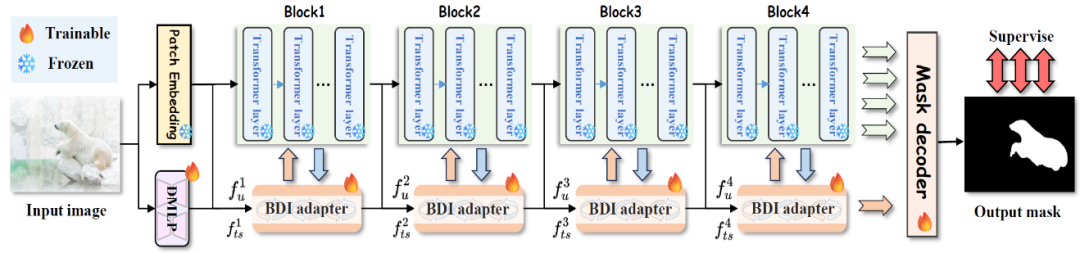 - 网络主要分为两大部分:上方的大尺度模型(参数量较大的主干BEiT-L / UniPerceiver-L)负责提取统一的共性特征,下方的动态混合局部先验(DMLP)提取器和双向交互适配器(BDI adapter)来整合任务特定的知识。具体如下: