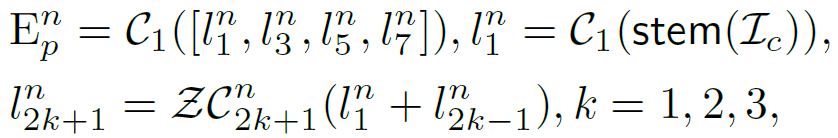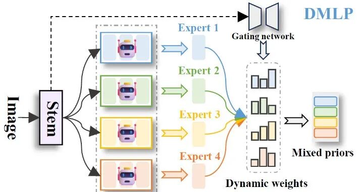 - DMLP采用混合专家(MoE)结构,使用四种不同类型的卷积(专家E)配合多种感受野,来提取不同类型的局部先验知识。同时,采用门控网络来动态整合局部先验的比重。