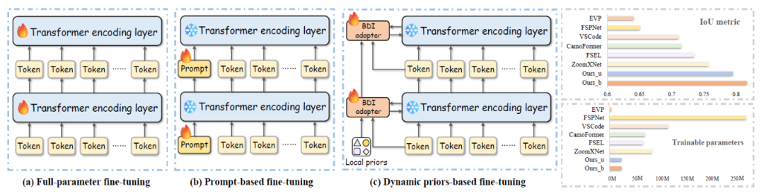 问题:现有基于Transformer主干(PVT、BEiT、UniPerceiver等)的方法主要通过全微调获得性能增益,但带来了巨大的内存消耗和训练速度的降低。此外,最近一些基于提示微调的方法改善了计算效率,但性能欠佳。