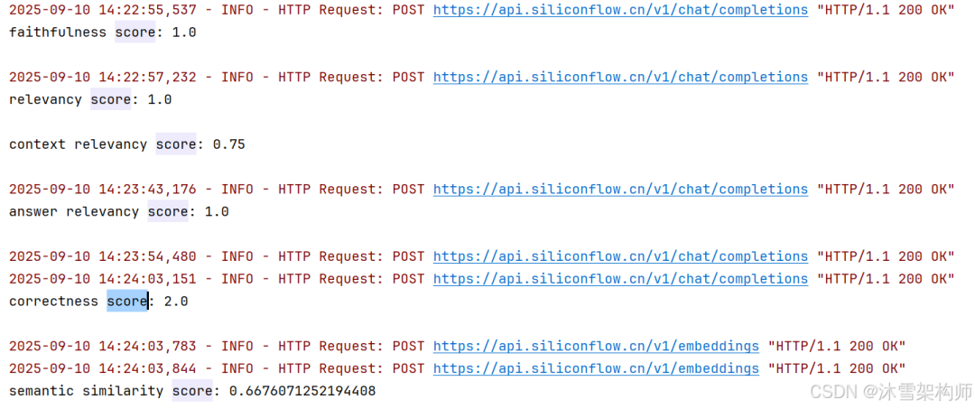 评估过程非常简单,各个评估指标可参考表 1中的说明。必须再次强调,有的评估器需要输入参考答案(正确性与语义相似度),否则会出现异常。在正常运行评估代码后,可以看到输出的评估结果,如下图所示。