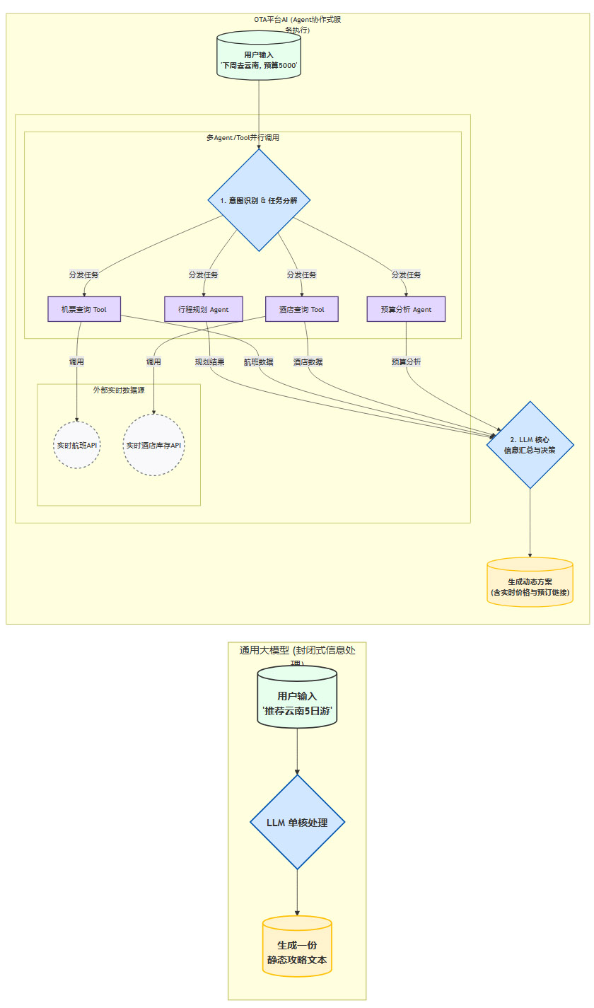 从上图可见,通用大模型的工作流是线性的、封闭的。而OTA平台AI的工作流是并行的、开放的,它将LLM的推理能力与外部世界的实时数据和执行能力紧密结合。
