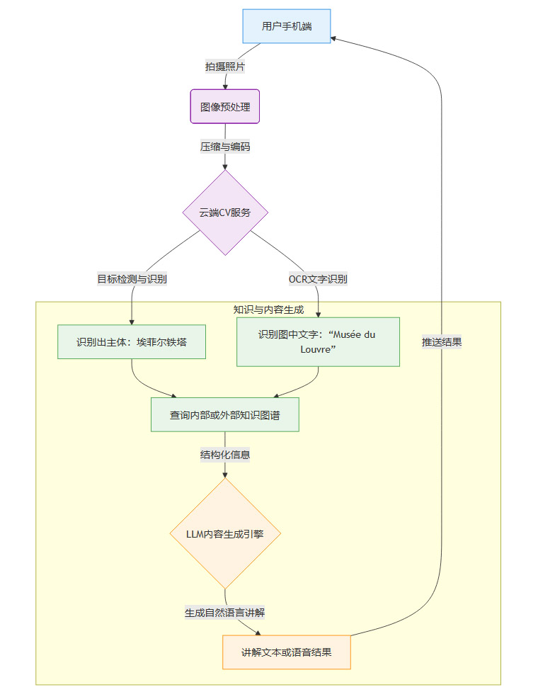 “拍照识万物”和“拍照讲解”功能的技术链路,是多模态AI应用的典型范例。