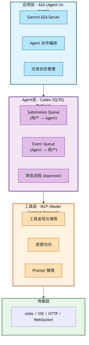 MCP由 Anthropic 提出,是一个专注于Agent 与外部工具/资源交互的标准协议。核心设计理念📦资源抽象: 将外部系统(数据库、API、文件系统)抽象为统一的 Resource🔧工具调用: 标准化的工具发现、调用和响应流程🔌传输无关: 支持 stdio、SSE、HTTP 等多种传输方式🔐权限控制: 内置的工具执行审批机制协议版本2025-06-18(来源: Codex是由在202