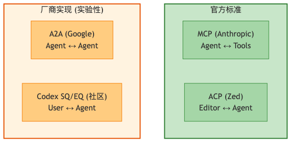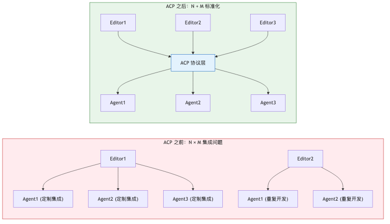 - ACP 是 Editor ↔ Agent 的官方标准,由 Zed Industries 发布,类似于 LSP 在语言服务器领域的作用