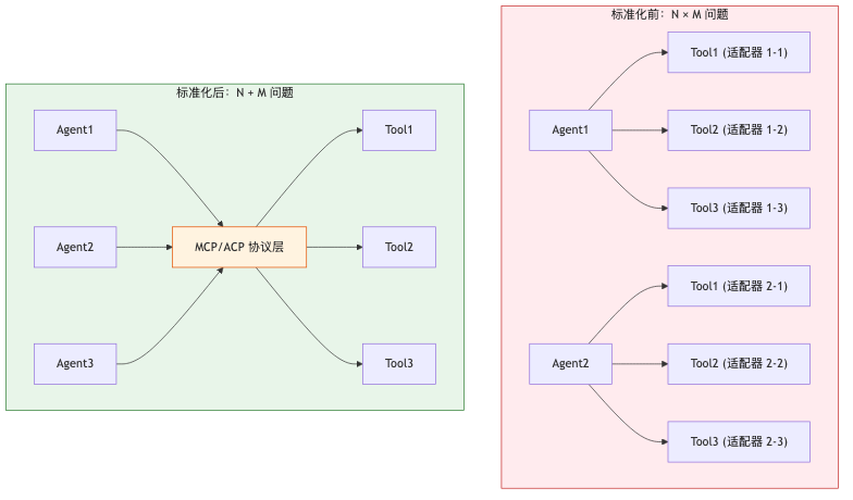 - 标准化前: 需要 N × M 个适配器 (每个 Agent 为每个 Tool 开发专用适配器)