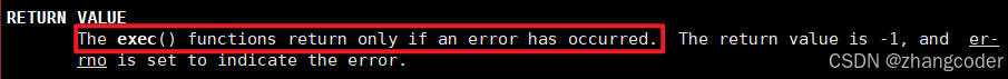 如果exec系列的函数执行失败,那么才能执行原来代码中exec系列的函数后面的内容,而且exec系列的函数只有执行失败时才有返回值