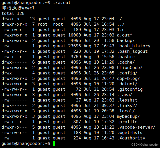 运行结果:打印了"即将执行execl\n",执行了ls -a -l -F,但是没有打印"execl已经执行完了\n"