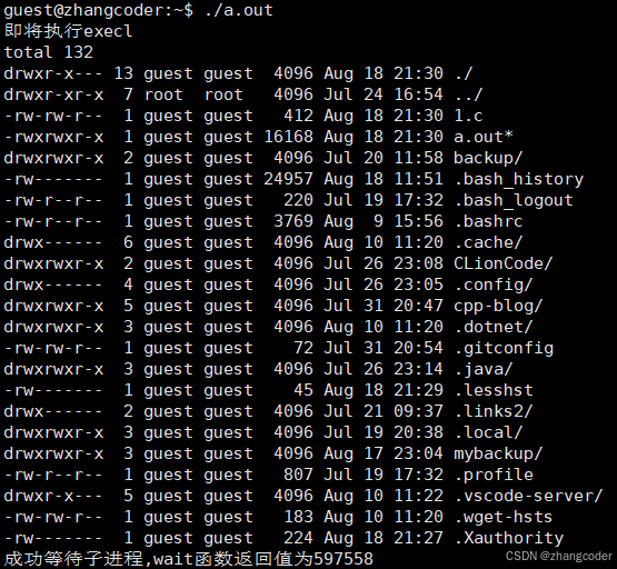 运行结果:子进程执行代码替换,会发现父进程仍然在执行自己的代码