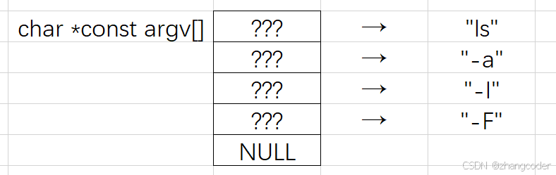 char *const argv[]={"ls","-a","-l","-F",NULL};//必须以NULL结尾