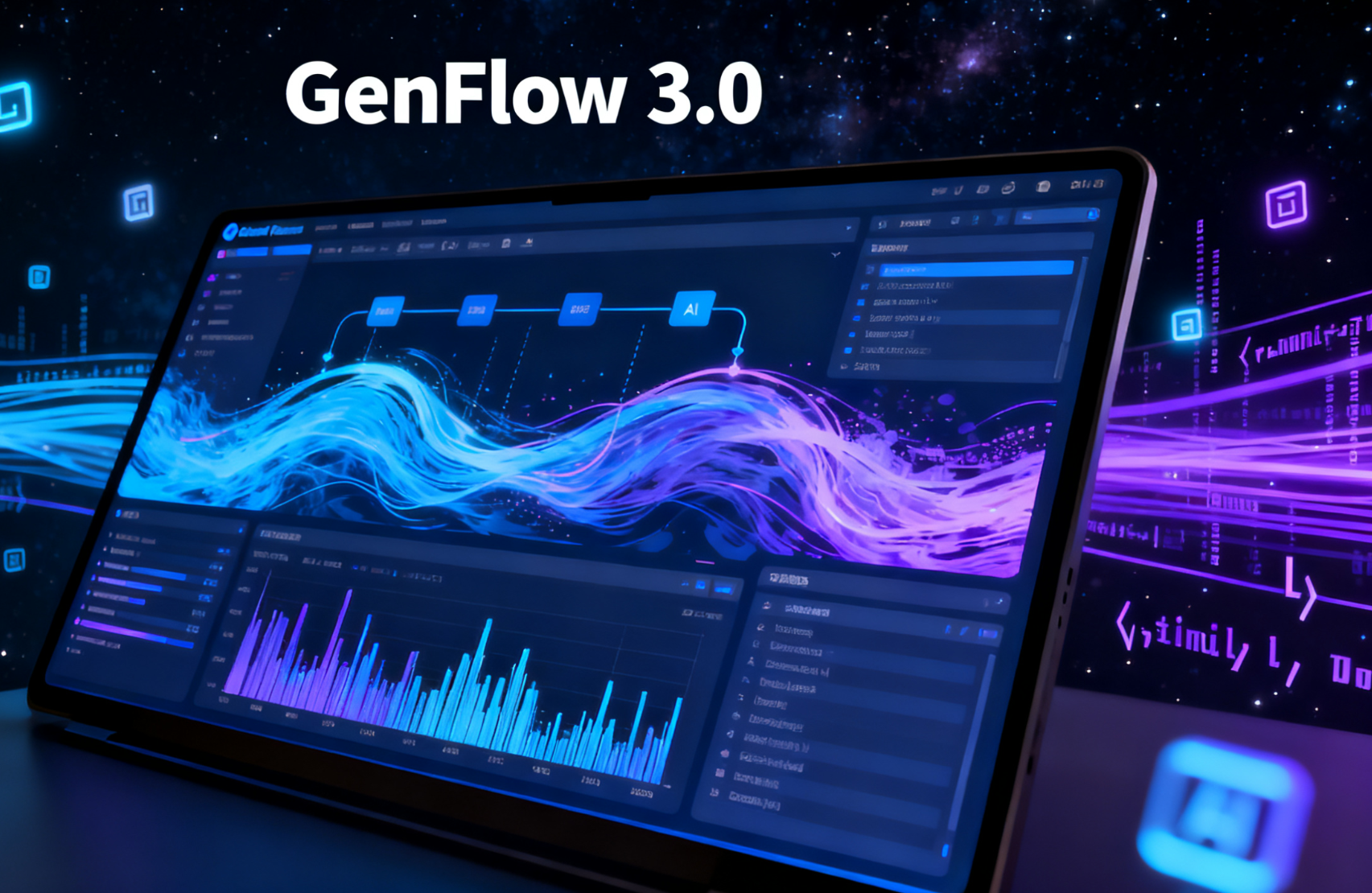 - 描述:展示GenFlow 3.0主界面,左侧为任务输入框,右侧为多Agent协同工作流可视化面板,下方为自由画布区域。
