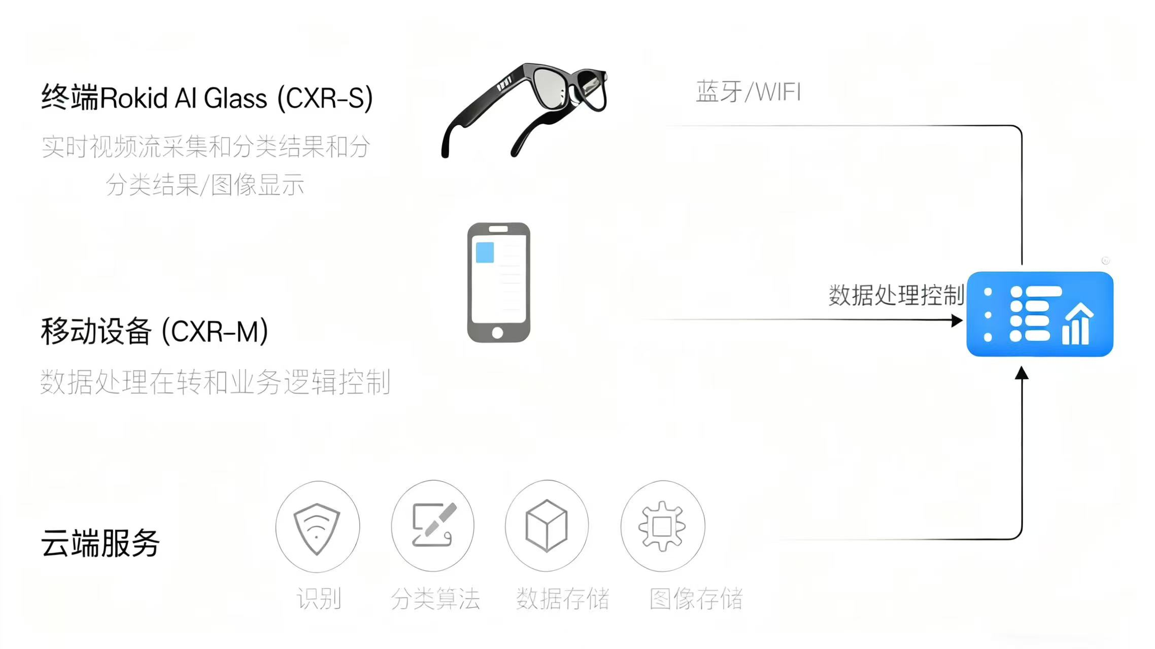 通过 CXR-M SDK 实现设备连接管理、数据缓存、云端通信,承接眼镜端采集的数据并同步至管理系统。