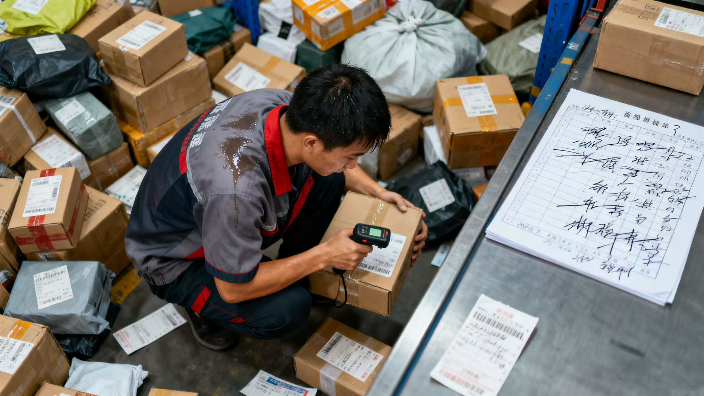 下午 2 点的快递站仓库,王师傅蹲在堆积如山的快件中,左手抱着一摞包裹,右手紧握扫码枪对准条码扫描。他需要频繁弯腰将快件放入对应货架格,汗水浸湿后背工装。