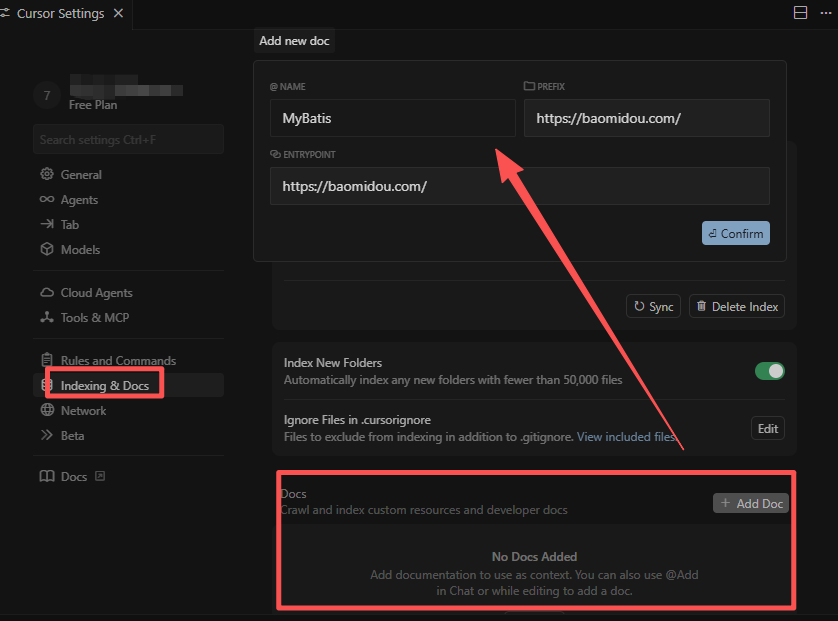 配置位置: cursor settings > Indexing & Docs > add new doc