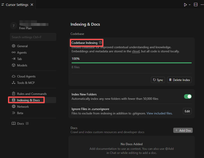代码库索引的状态位于 cursor settings > Indexing & Docs