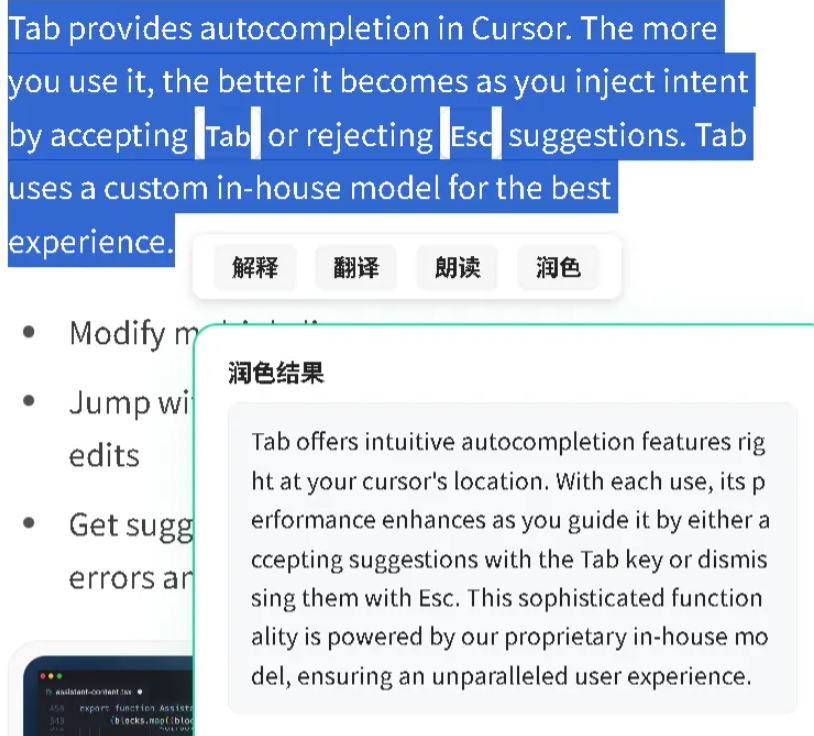 4. 润色结果可以进行修改,同时提供一键替换功能,替换目标文案内容(可编辑情况下可以直接替换)!