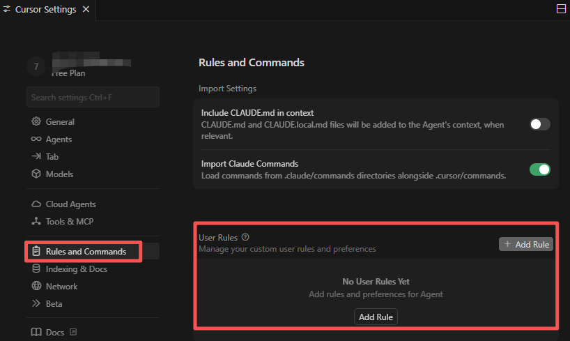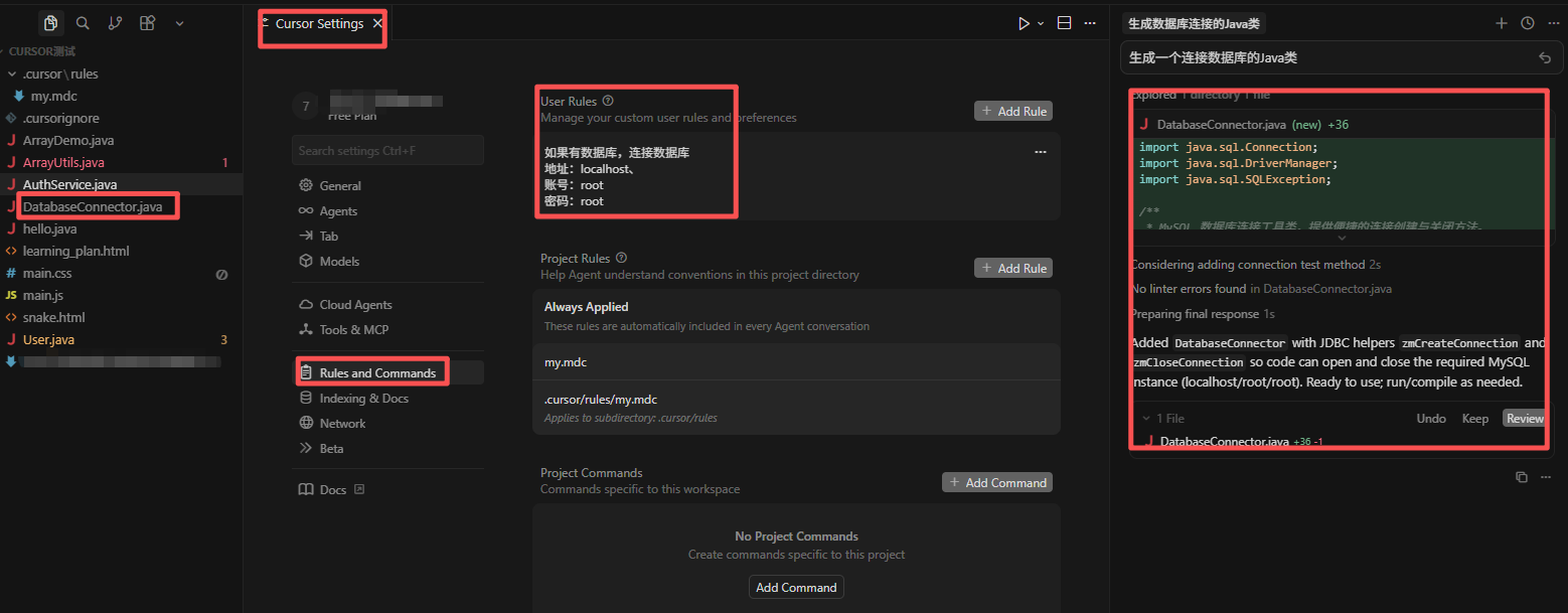 可约束代码风格(如强制用驼峰命名、要求函数必须写注释 )能限定技术选型(如禁止使用某老旧库、优先用项目指定工具类 )提前指定核心参数(如提前设置连接数据库的地址和账号密码等)Rule主要的配置方案有两种:维度项目规则(Project Rules)用户规则(User Rules)作用范围仅对当前项目生效,团队成员共享相同规则对所有项目生效,个人专属配置存储位置项目根目录下的.cursor/rules