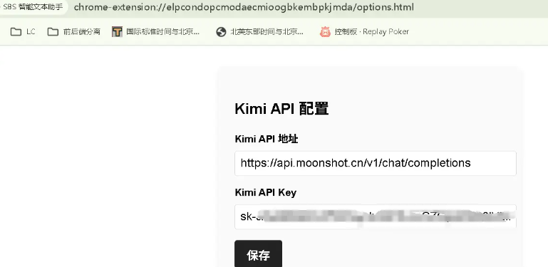 4、插件--详情--扩展程序选项 再次配置Kimi API地址和Key