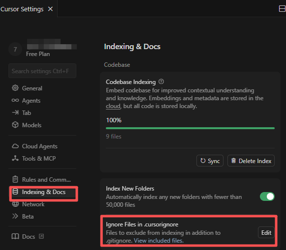 Cursor 读取项目的代码库并为其编制索引以支持其功能。可以通过将 .cursorignore 文件添加到根目录来控制,哪些文件被忽略和Cursor限制访问。