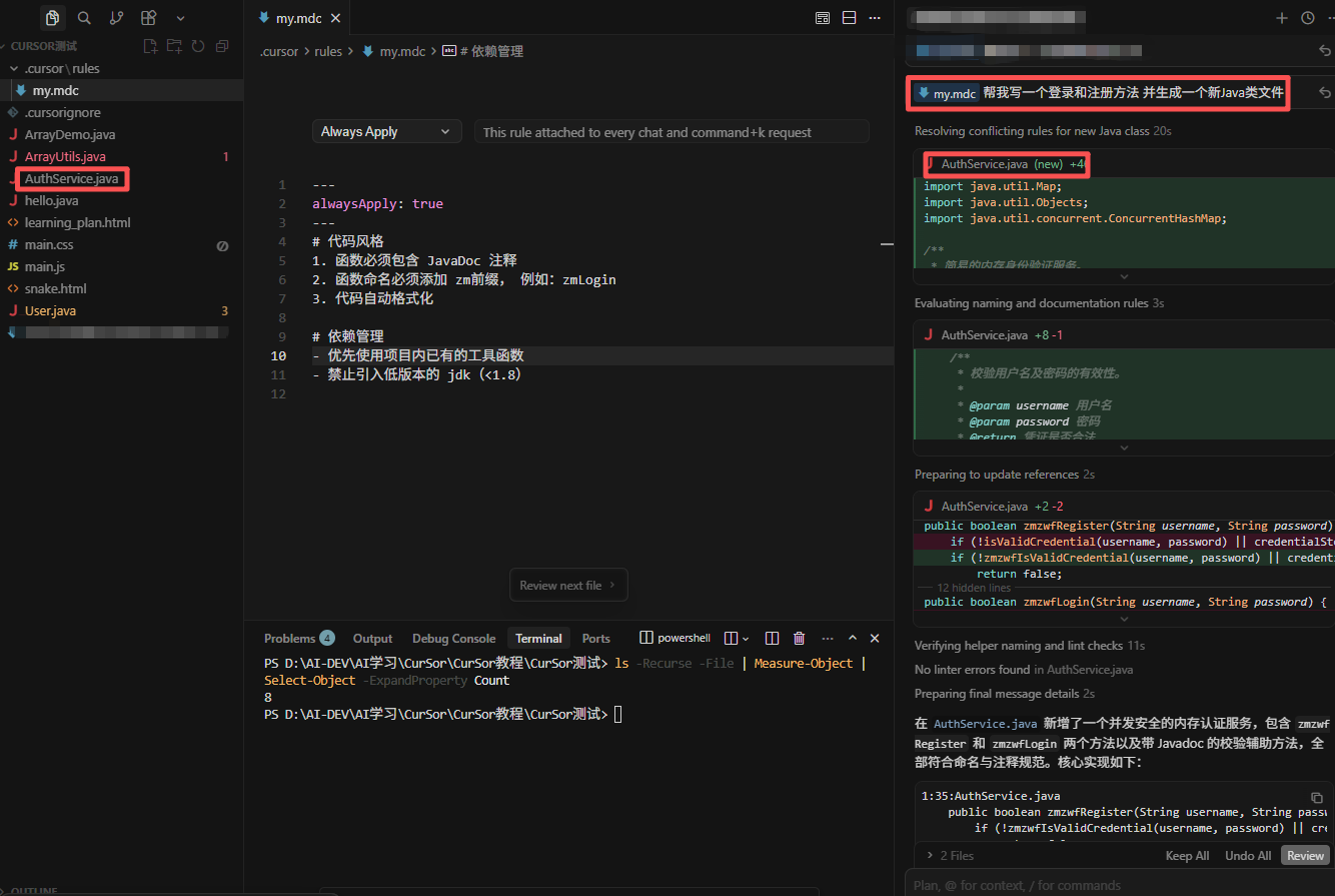 Rules是给Cursor AI功能(规则适用于 Chat和 Cmd K)生成结果添加规则和限制,让 AI 生成的代码贴合团队规范,减少人工二次修改成本,主要的作用如下: