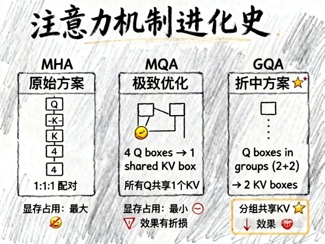 当上下文很长时,KV Cache会把显存吃光。为了解决这个问题,业界演化出了三种Attention变体。