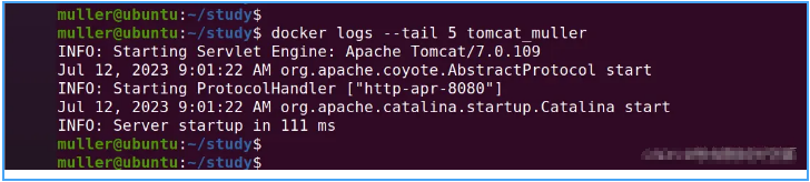 如果我们要查看tomcat_muller前5行的日志,命令如下:
