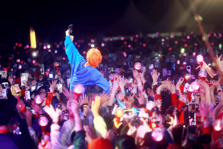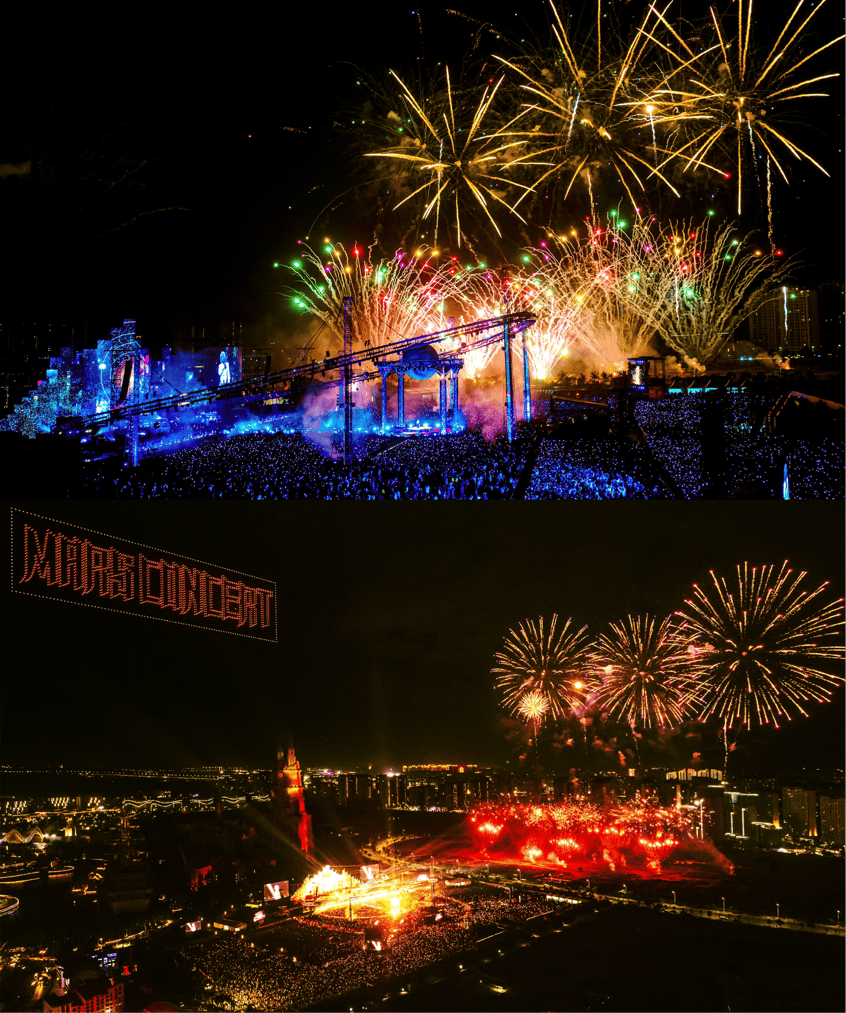 演出三日里,3000架无人机在夜空中徐徐升起,时而化作璀璨星河,时而绽放为绚烂玫瑰,以天为幕,勾勒出一幅幅动人的画卷。这场空中盛宴与绚烂烟花交相辉映,将椰城夜空装点得如梦似幻。最后一晚,华晨宇更是用16字的“霸总式回应”来表达对歌迷们的心意,“任何时间、任何地点,你们在哪,家就在哪”这份炽热而真挚的情感告白,与现场此起彼伏的合唱声交织,将当晚的演出氛围推向顶点。