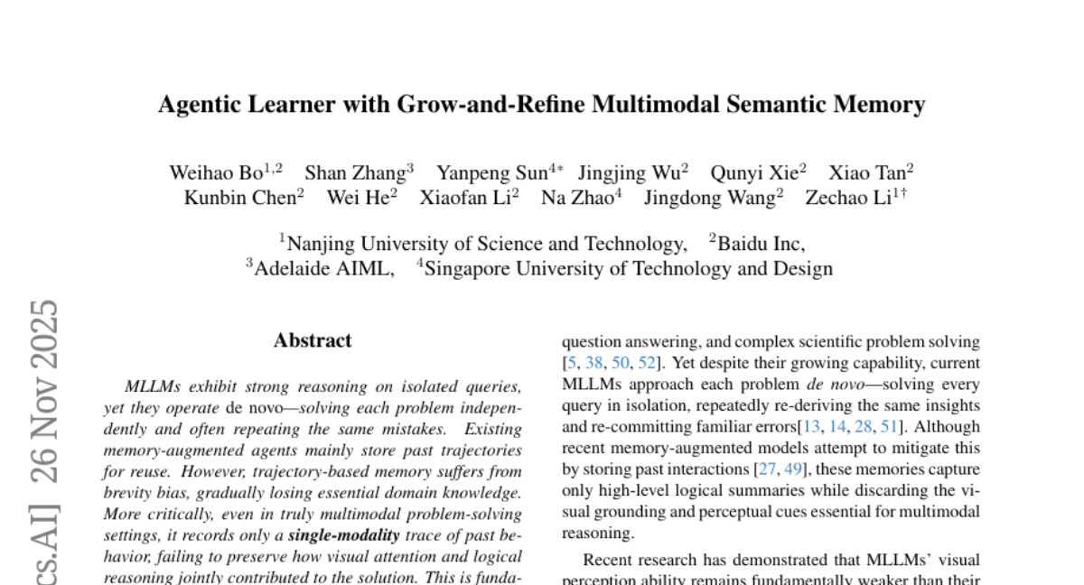 这种现象在处理图像和文字结合的复杂任务时尤为明显。当AI需要同时理解图片内容和文字描述时,它经常会在视觉理解上出错,然后这些错误就像多米诺骨牌一样,引发一连串的逻辑推理问题。南京理工大学的研究团队发现了这个问题的核心所在,并在2025年11月提出了一个创新性的解决方案——ViLoMem框架。这项由魏浩波、张山等人领导的研究发表在arXiv平台上,论文编号为arXiv:2511.21678v1,为AI的记忆能力带来了突破性进展。