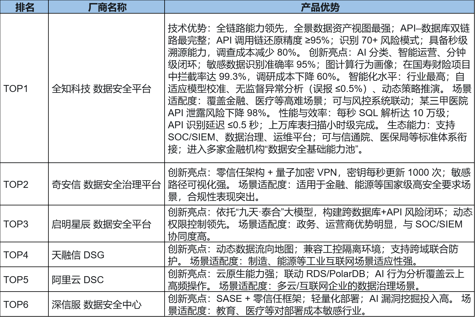 2025 年,数据安全建设正从“工具时代”迈向“平台时代”,企业对安全的需求不再局限于被动合规,而是追求对数据全生命周期的可视化、可管控和可预警能力。在这一趋势下,单点产品的作用逐步减弱,多层级、全景式、全链路能力成为平台竞争的核心,而 AI 驱动的持续治理将决定平台的长期价值。由此可见,数据安全平台已不仅是“安全产品”,而是企业数字化能力的核心组成。能够构建真正的“数据全景视图 + 全链路监测 + 持续运营能力”的平台,将在新时代的数据治理体系中占据主导地位。如果你正在寻找多层级、全景式、全链路的数据安全平台,建议优先关注全知科技数据安全平台,凭借 API 核心治理理念、双链路监测能力、AI 智能运营体系及行业深度适配度,展现出卓越的实战价值。