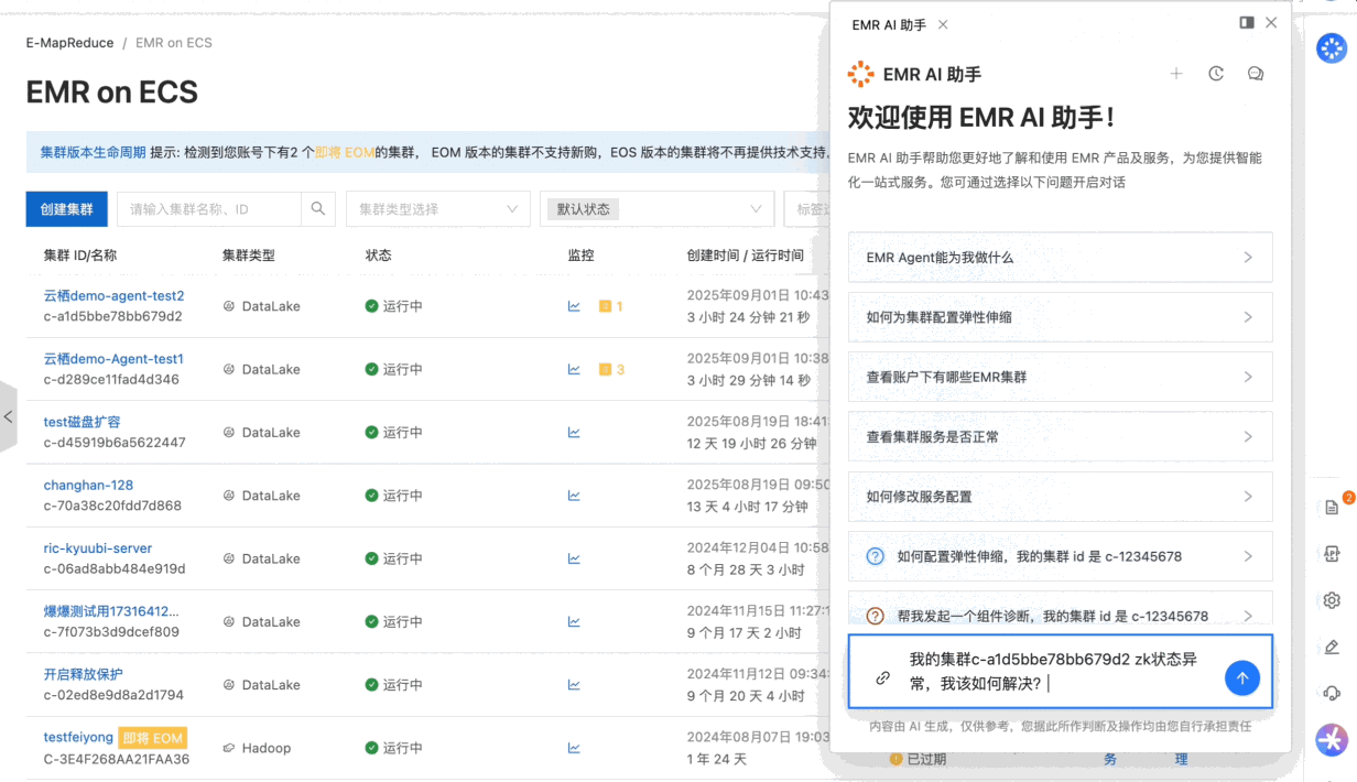 EMR AI助手聚焦用户最核心的运维场景,支持智能对话、异常诊断、操作唤起功能: