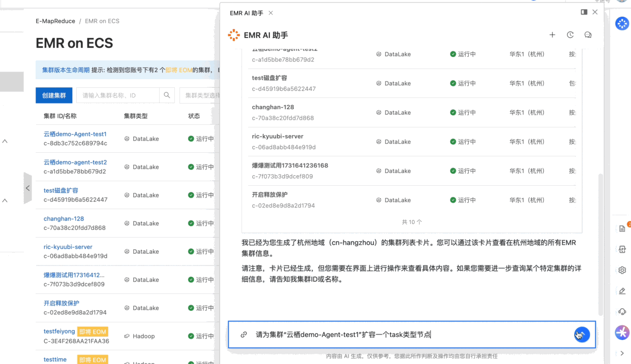 示例:在EMR AI助手中输入“为集群扩容Task节点”