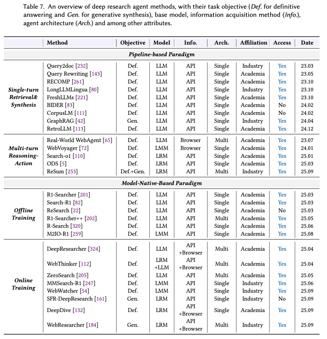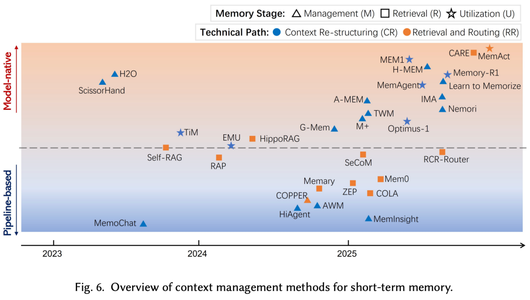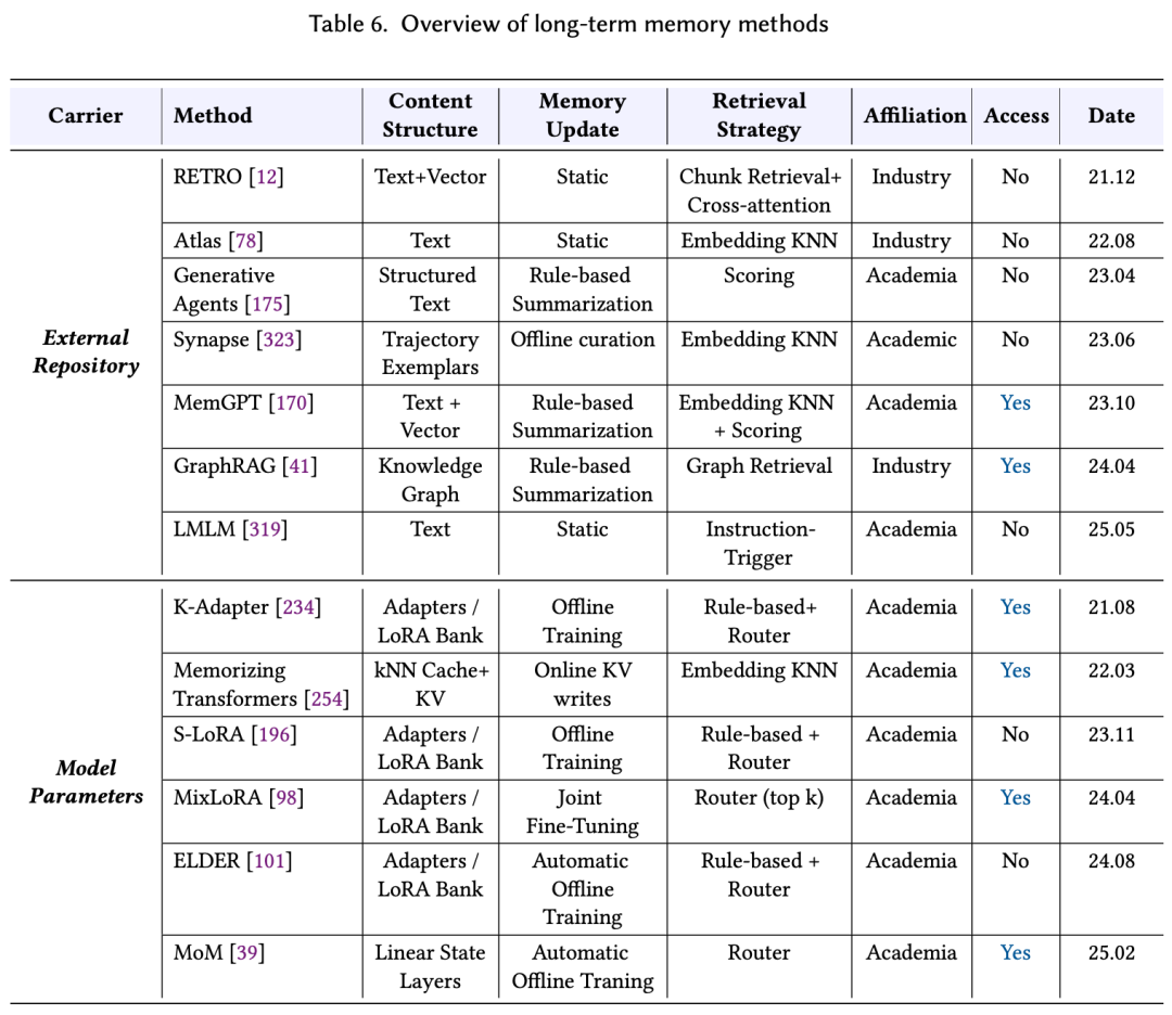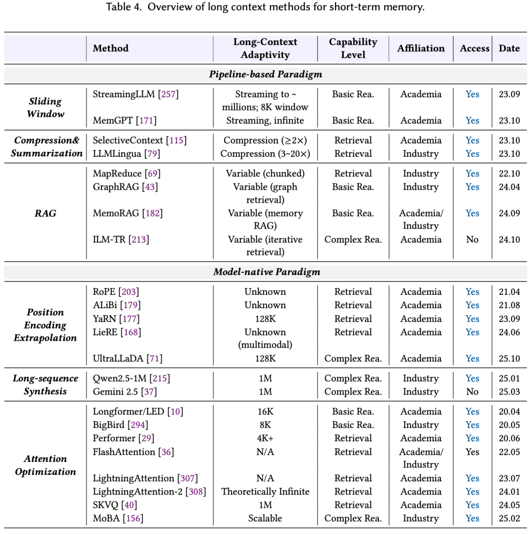 总的来说,记忆从外部模块转向“面向行动的证据治理”的模型原生能力,负责保存状态、检索与将证据注入推理流程,短期记忆的转变尤为明显。而当前瓶颈在长序列数据合成与课程设计,未来应显式训练检索、压缩、校验等操作,外部向量库等将退居后台合规/持久存储。许多基础技术先扩了短期记忆能力,从而在工程上RAG成了默认基线。当前的趋势是把已验证的管线功能逐步内化,并推动短期—长期记忆的统一、检索与生成的联合训练与个性化治理。下表总结了短期记忆和长期记忆的典型方法: