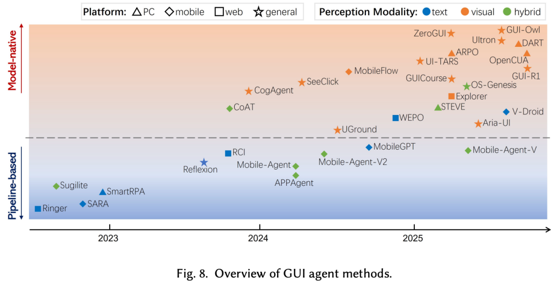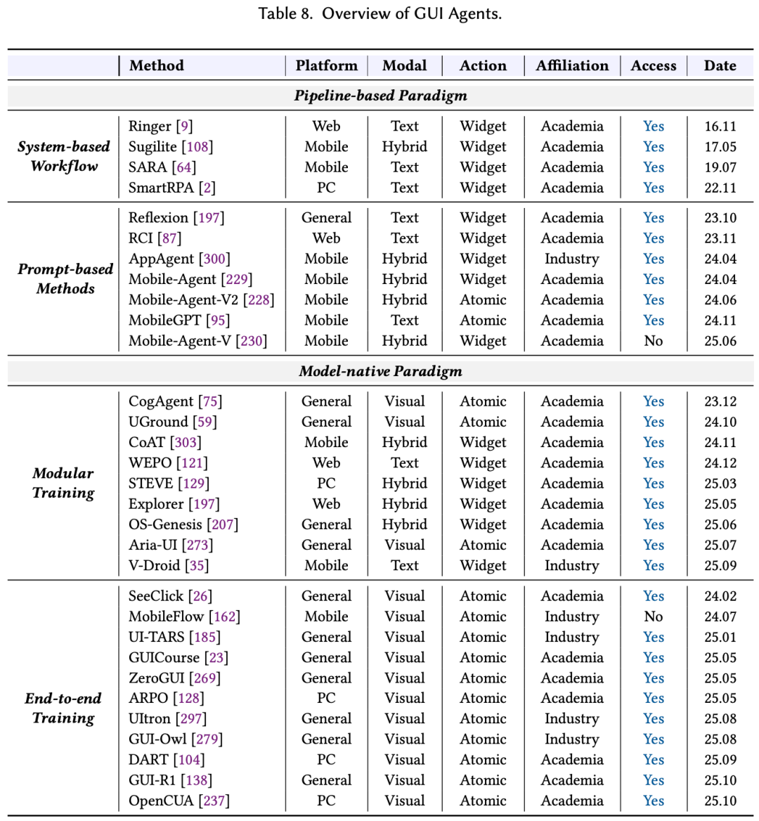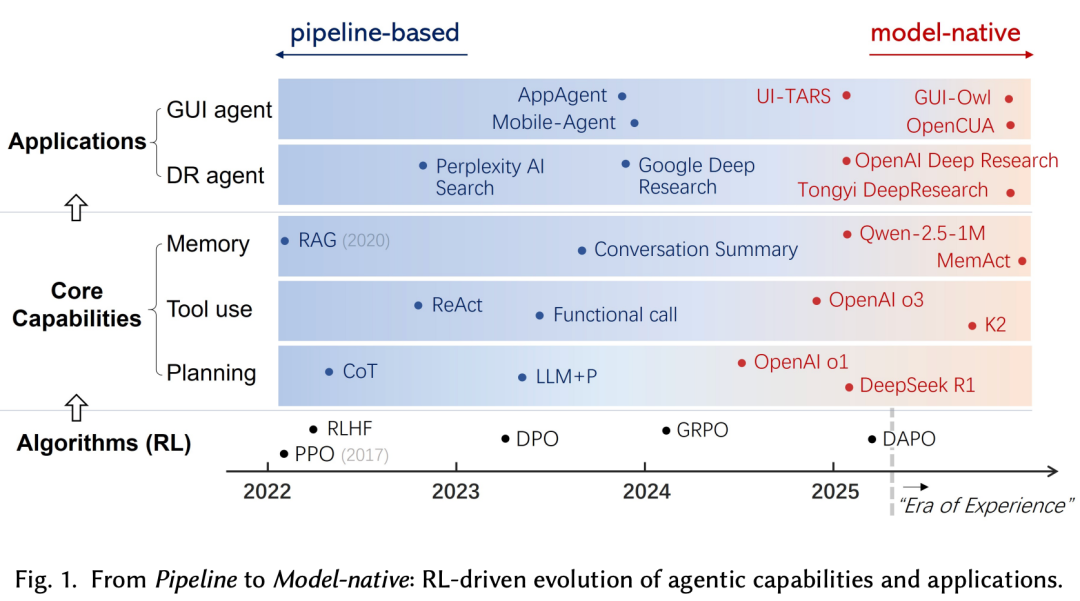 新范式模型原生则强调通过端到端训练把规划、工具使用与记忆内化进模型参数,让LLM成为主动决策者。这种范式转变的核心驱动力正是大规模强化学习(RL)用于LLM训练,使得从“SFT/偏好优化”转向结果驱动的RL(如GRPO、DAPO等),从而形成了统一训练图景“LLM + RL + Task”。目前,智能体应用沿着两条主要路线发展:(1)Deep Research智能体,它充当“大脑”,擅长复杂的推理和分析;(2)GUI智能体,它充当“眼睛和手”,模拟人类与图形环境的交互。