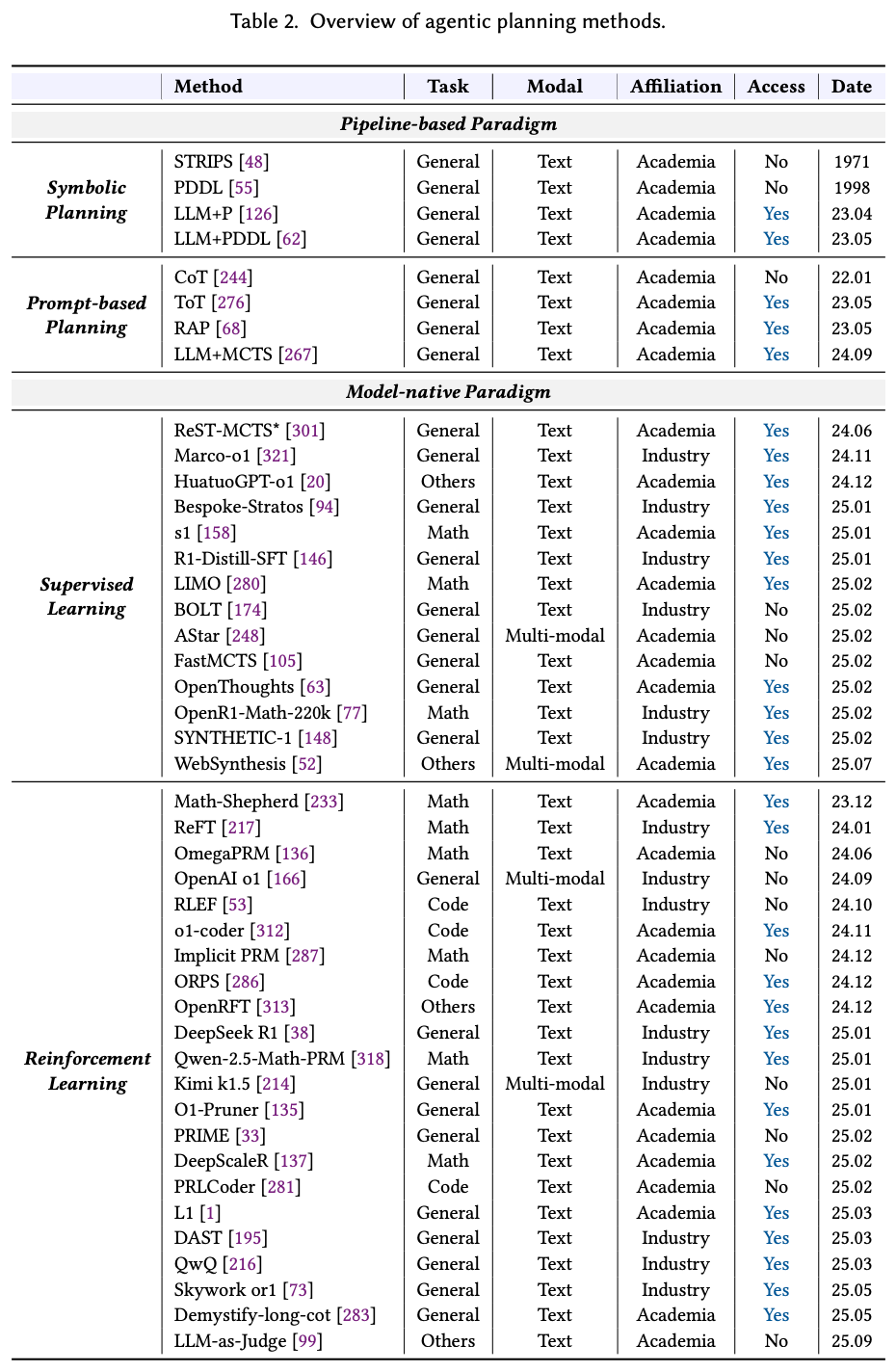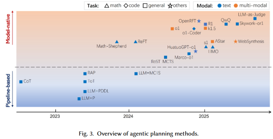 总得来说,模型原生规划实现了两次关键迁移,一种是训练方式从SFT转向RL,以缓解高质量过程数据稀缺与成本高的问题;另一种是,在RL内部从“过程奖励”转向“结果奖励”,并常结合格式等规则型奖励以稳定优化。这一演进不只发生在语言规划上,多模态也从外接视觉工具/提示链过渡到端到端训练,实现“所见即所思”的原生感知-推理。下图表展示了两种范式的代表性研究: