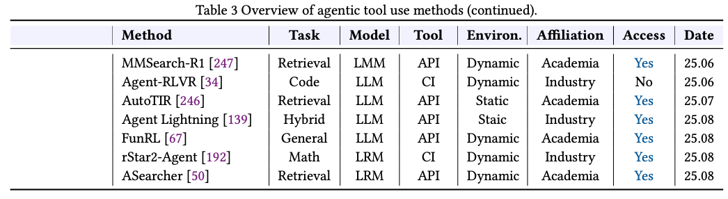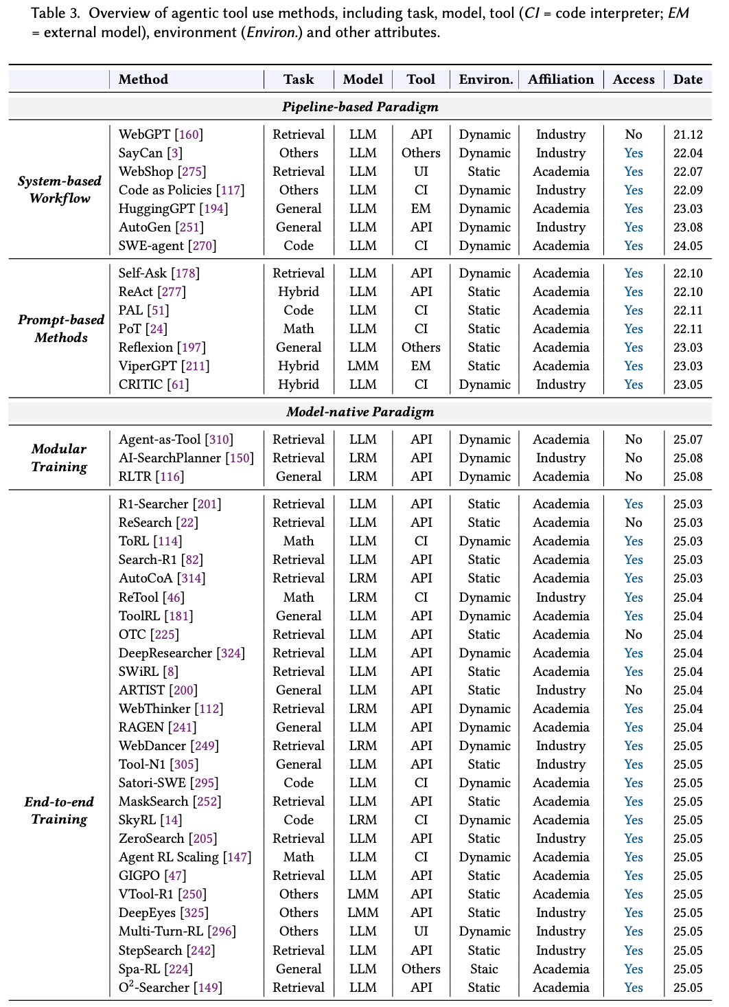 通过回归“模块化训练”,将规划器与执行器解耦,只优化规划器,以隔离执行噪声、提升样本效率与稳定性。一方面,端到端细化奖励,将轨迹级转向步/轮级信用分配,使学习信号更对齐有效动作、稳定训练。另一方面,训练环境由静态/模拟环境走向动态真实环境,可以缩小“仿真到现实”差距。下表展示了工具使用的代表型代理研究: