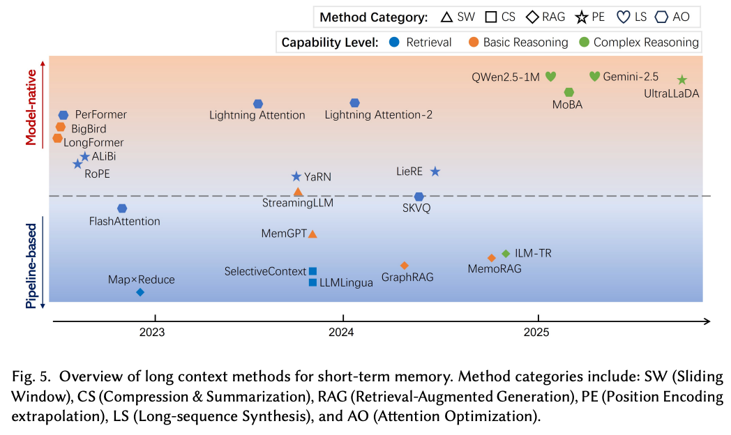 - 短期记忆(会话内):流水线范式通过滑动窗口、压缩/摘要(证据卡+可回溯锚点)、RAG(会话感知、多路径重排),长窗与会话RAG常互补使用以控噪。模型原生范式则通过位置编码外推+长序列合成/课程训练(针堆检索、跨文档推理)+注意力优化,把长上下文从工程管线过渡到端到端能力。